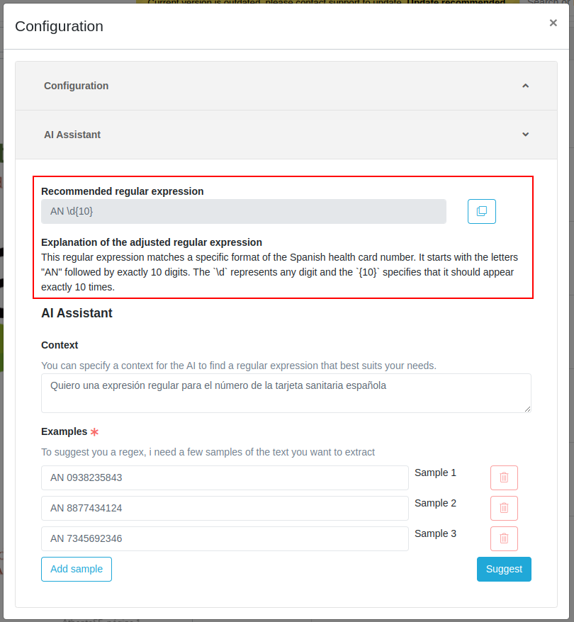 Once these values are specified, after clicking on the "Suggest" button, ChatGPT will suggest a recommended regular expression and an explanation of it.