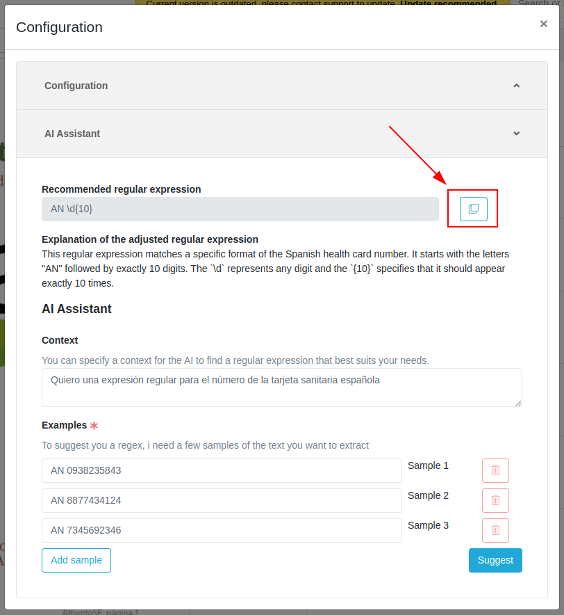 In case you do not know how to define regular expressions, you can get assistance from artificial intelligence. In the same pop-up window where regular expressions are configured, you will see a section "AI Assistant".