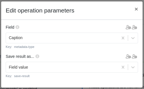 - Value of a document field. If we select this one, we must indicate the field in which this text will be placed, in the "Field" parameter of the operation.