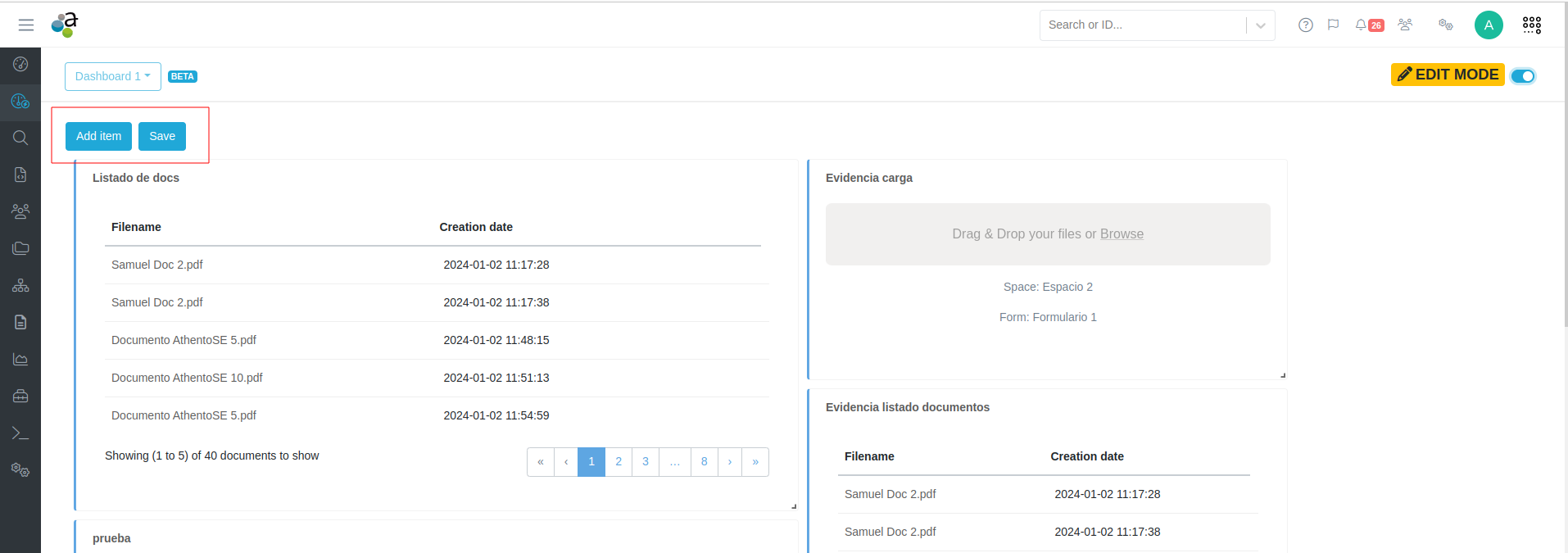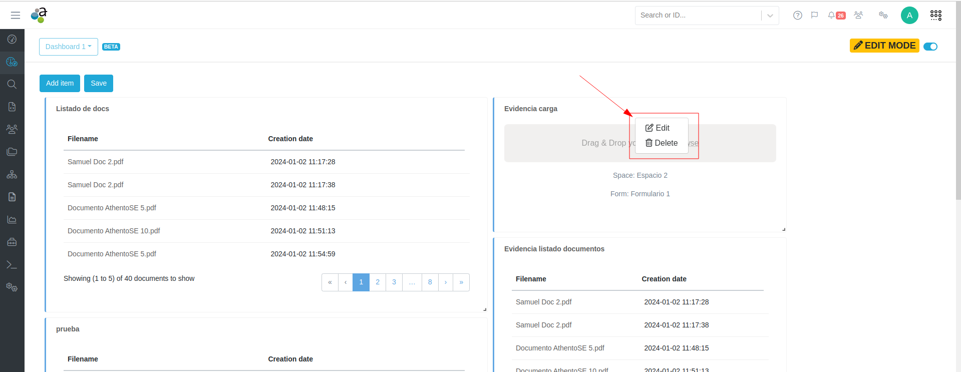 - Configure the dashboard from the user interface from the Edit mode, adding widgets and indicating in which position they should be displayed.