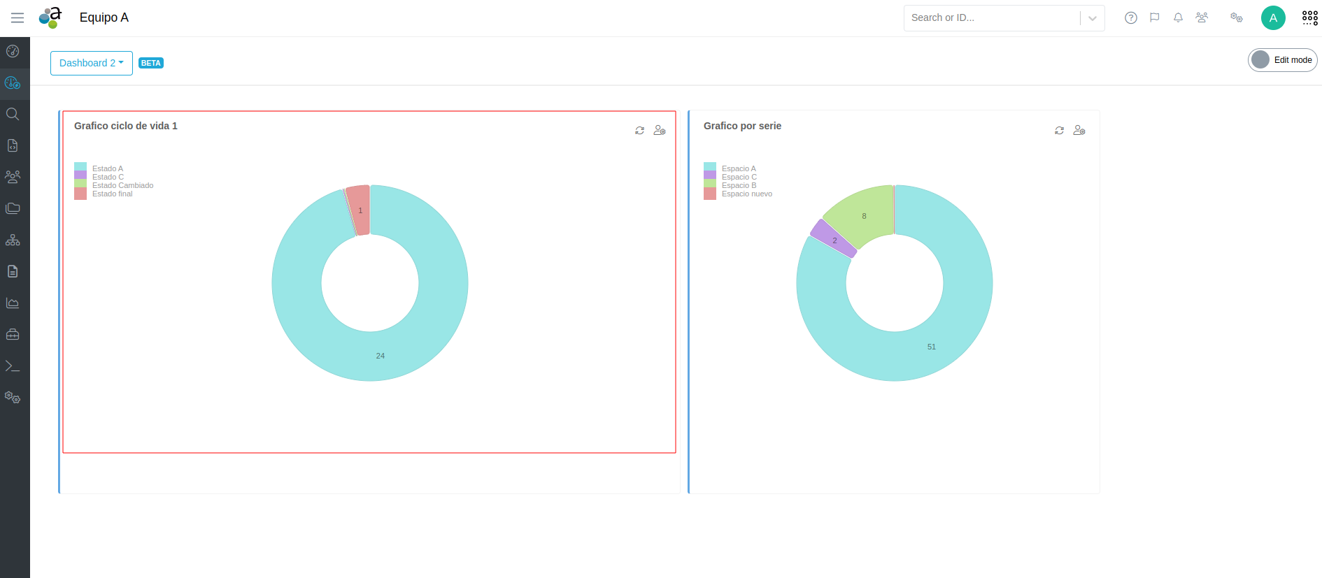 To configure these widgets, once the first dashboard has been created, we must go to the edit mode. This mode is only available to superusers and team administrators. It is activated by clicking on the button in the upper right corner of the dashboard.