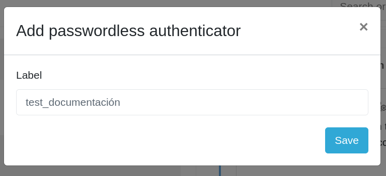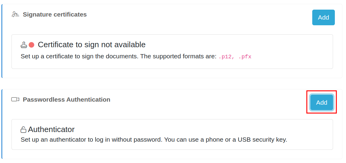 To register the security keys in the application, access the user profile. Go to "Passwordless Authentication". Click the "Add" button, which will open a pop-up window.