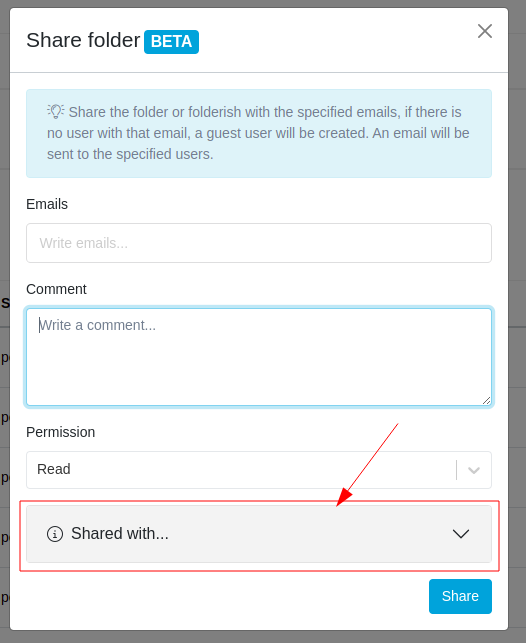 To share, go to the navigation and find the folder you want to share. In the 3-dot menu to the right of the folder name, you will find the “Share” option labeled BETA.