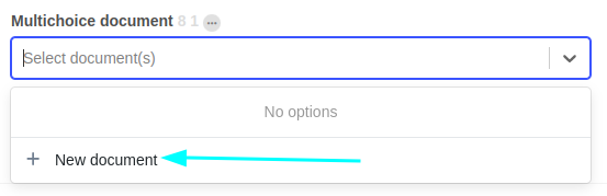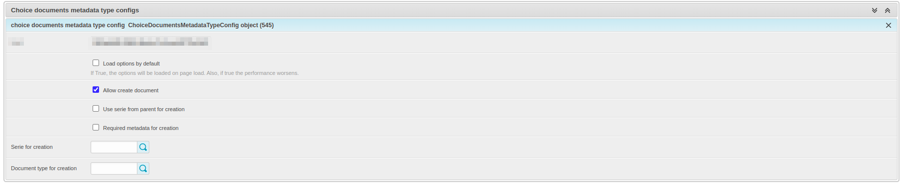 To allow the creation of new documents from a Choice/Multichoice field of subtype Document in order to set that new document as the value of that field, you must go to the advanced configuration of the field and open the “Choice documents metadata type configs” tab: