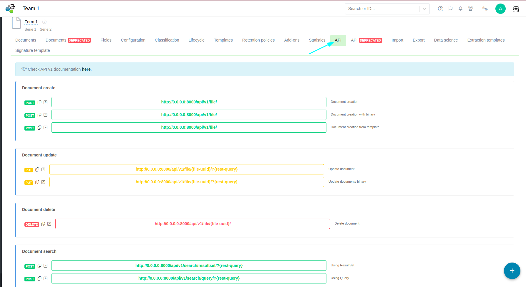 The API tab in the forms will show us information about endpoints related to the API v1 that can be used.
