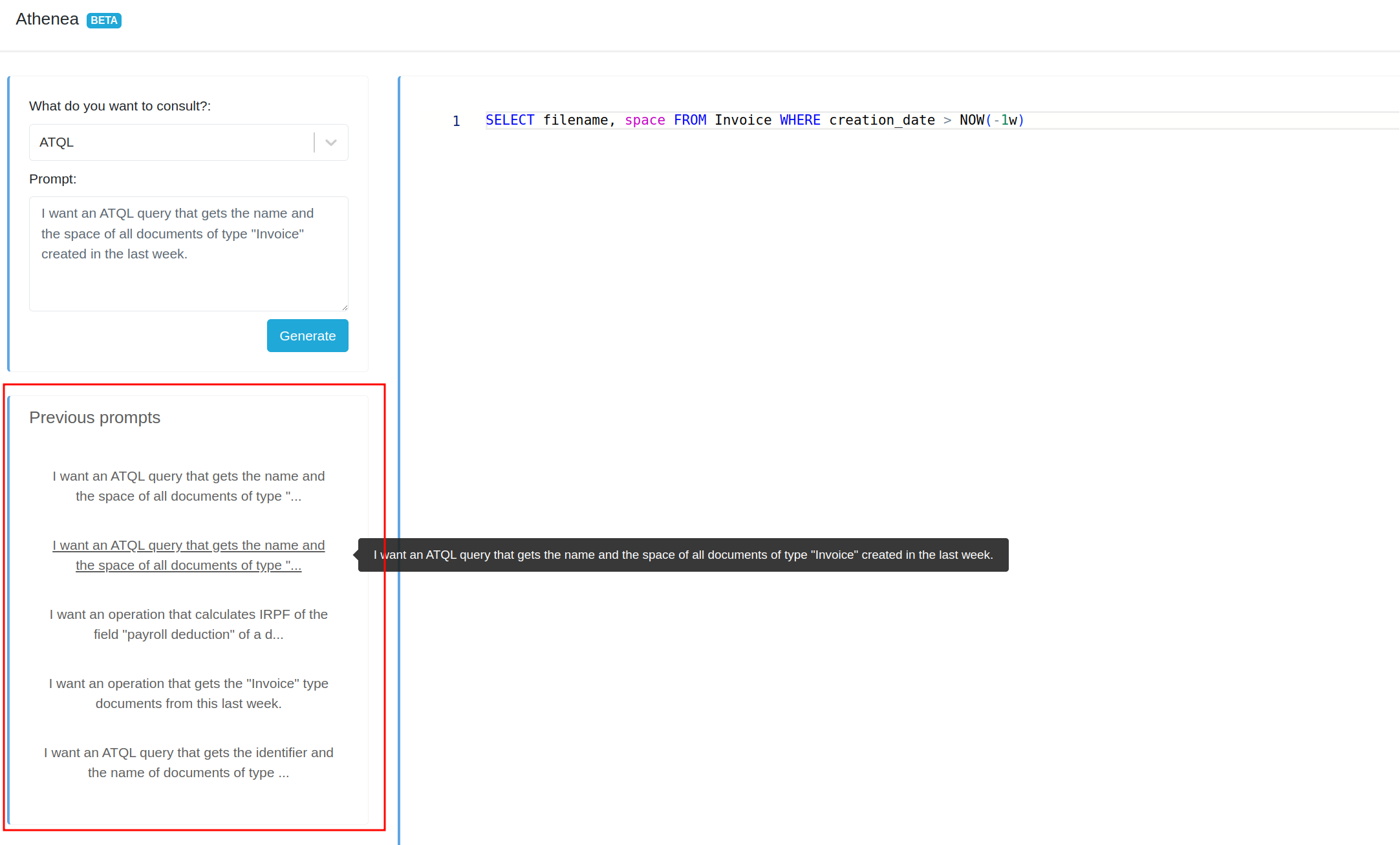 To generate ATQL queries using AI, access Athenea.