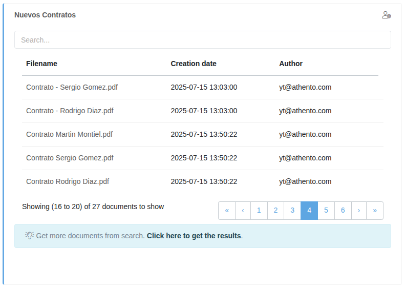 Athento allows you to add a search widget to new dashboards. These widgets are designed to facilitate access to specific documentation and have a pre-configured search at the form and field level.