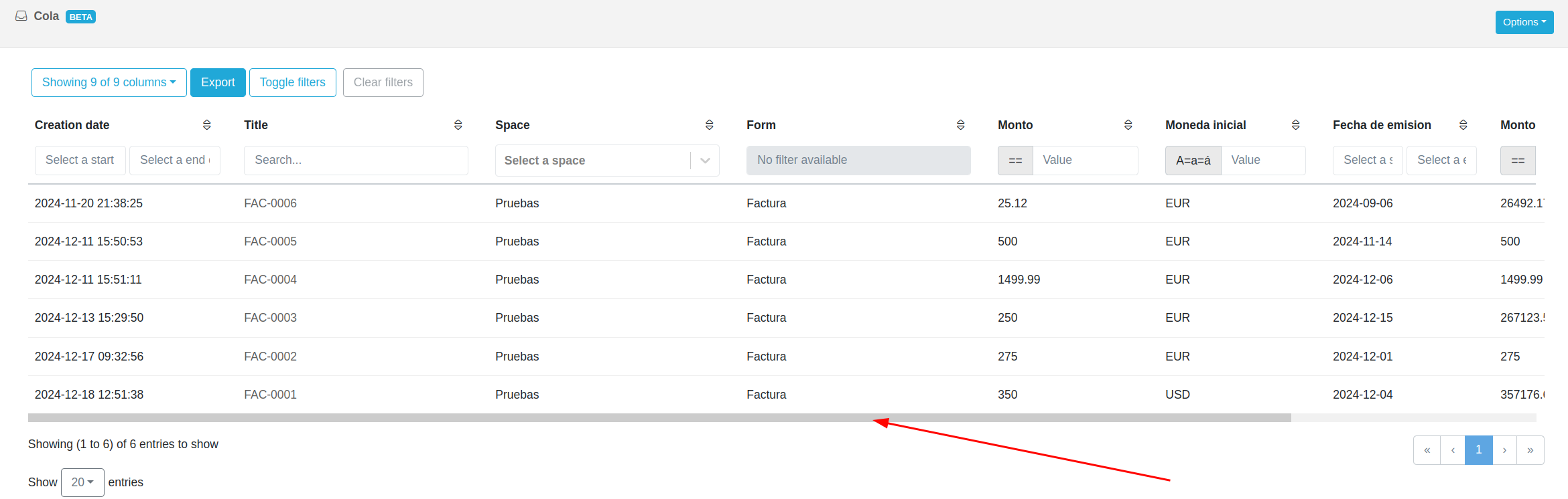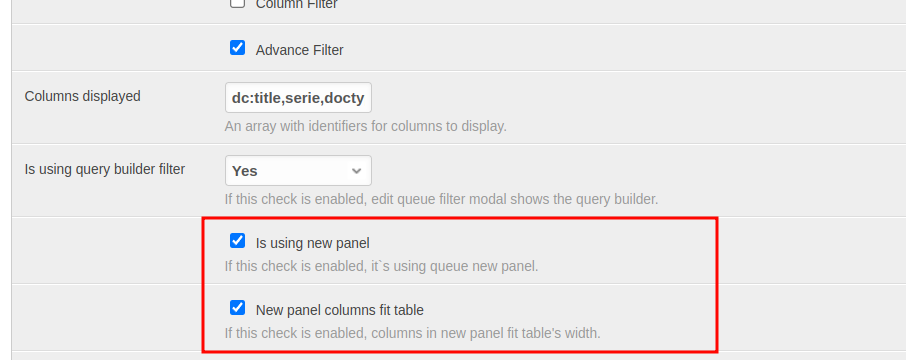 To fit the columns of a tray or queue to the width of the table, from the Advanced Administration of the queue you must check the attribute “New panel columns fit table”. This functionality also requires the activation of “Is using new panel”.
