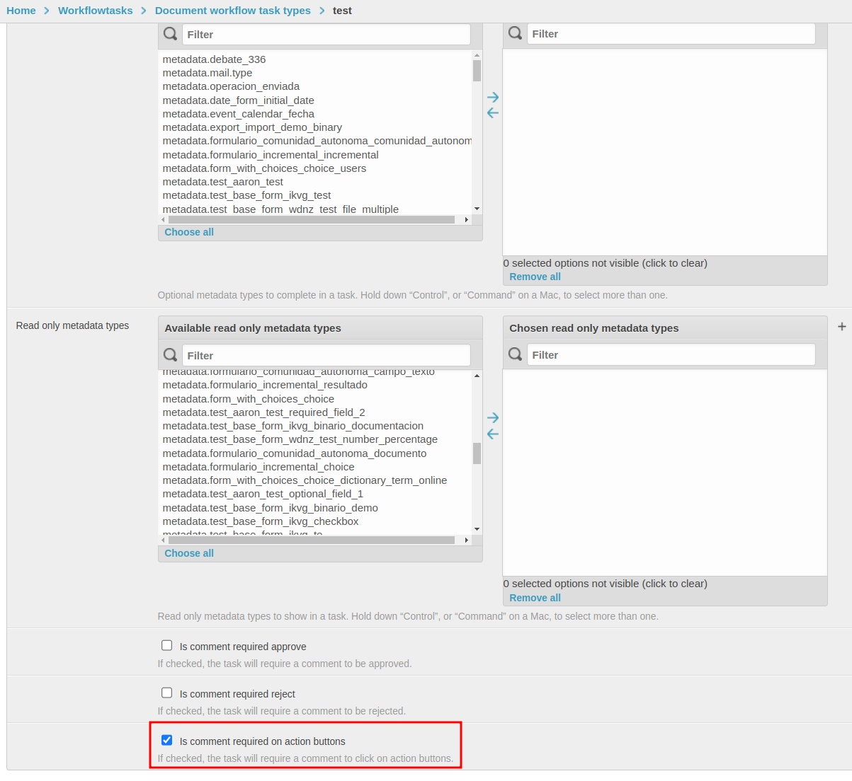 Athento allows you to require comments in order to click on the action buttons for a task. To do this, the first thing you need to do is access the administration of the type of task you want to control and enable the “Is comment required on action buttons” checkbox.