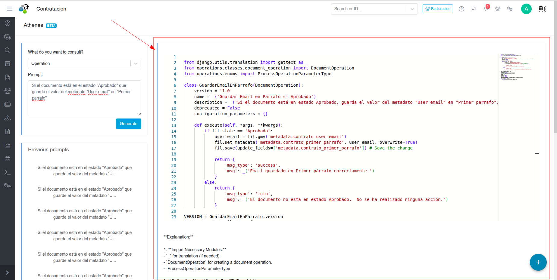 After specifying the message, if we click the “Generate” button, Athenea will generate an operation using the context of the space and the message entered.