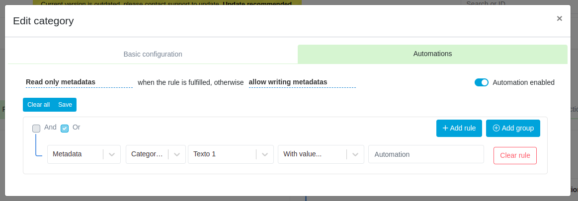 For example, the rule defined in the image will mean that when the field "Text 1" has the value "Automation", all fields in the category will be set to read-only, while if it has any other value, all fields in the category will be allowed to be written to.