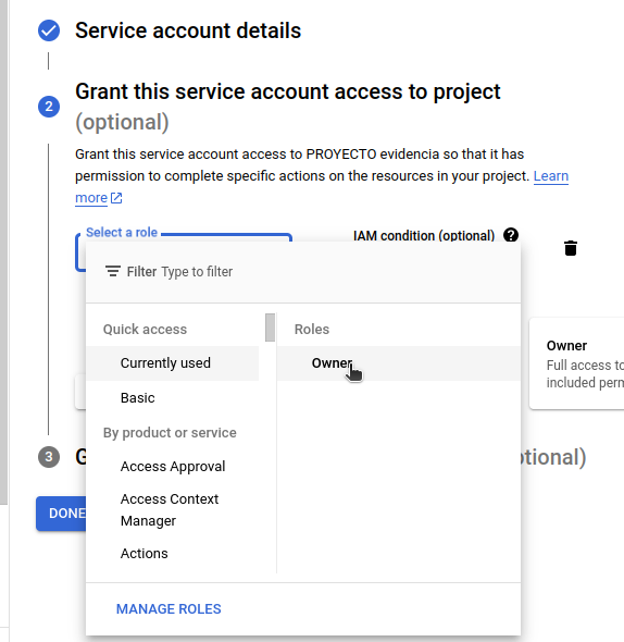 4.- In the service account creation form, a name must be entered and, in the second step, "Owner" permissions must be granted.