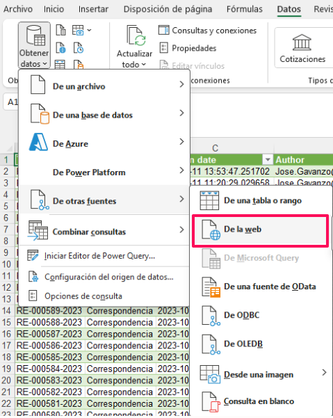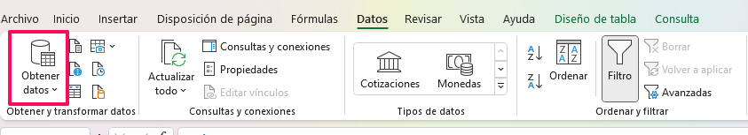 Sobre el reporte general que ya debe haberse descargado, vamos a la opción de Datos -> Obtener datos: