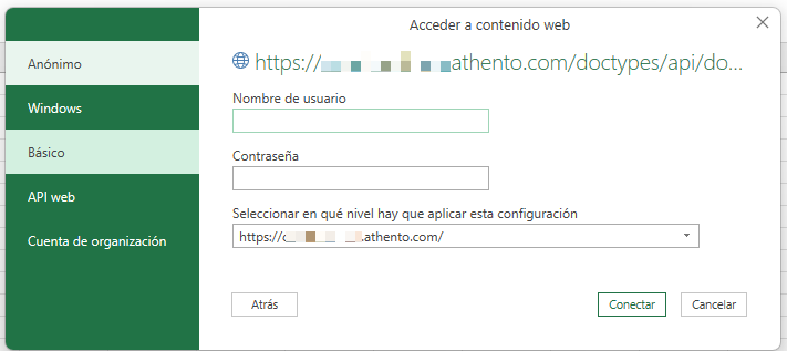 Se generará un nuevo recuadro, sobre el cual nos deberemos loguear para obtener la actualización de los datos. Para ello debemos ir a la opción "Básico" y diligenciar nuestro usuario y contraseña de la instancia sobre la cual obtendremos los datos y finalmente clic en el botón Conectar: