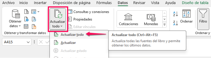 Para actualizar los datos del reporte, será necesario abrir nuevamente el reporte previamente guardado. Ir a la pestaña Datos y seleccionar la opción "Actualizar todo" que a su vez despliega la primera opción Actualizar todo: