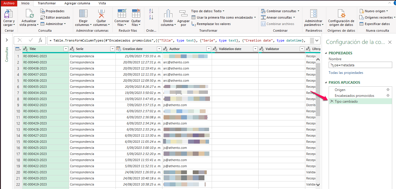 Una vez se realice la conexión, aparecerá el listado de registros a actualizar por lo cual se debe dar clic sobre el botón Transformar datos que se encuentra en la parte inferior del recuadro: