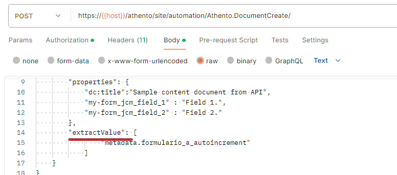 Hay que utilizar el parámetro extractValue en caso de que se necesite obtener el valor de un conjunto de campos en la respuesta después de la creación del documento. Esto resulta útil, por ejemplo, cuando se trabaja con campos de incremento automático, utilizados como identificadores de documentos para usuarios empresariales.