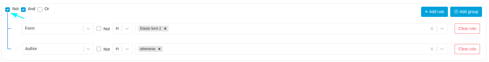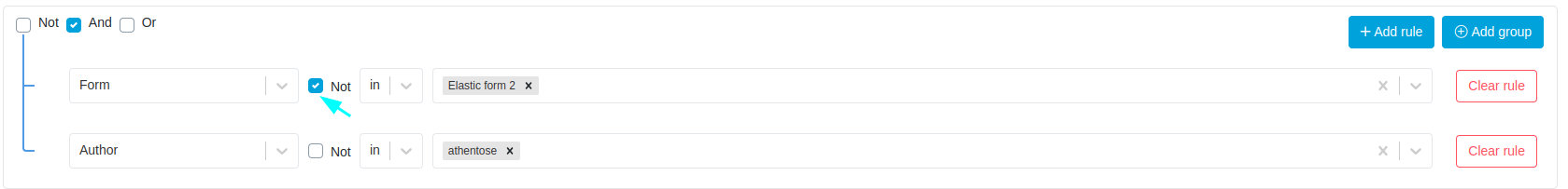 En este filtro de ejemplo, sólo los mostrará los documentos en los que se cumpla que el formulario NO es "Elastic form 2" y que el autor sea "athentose".