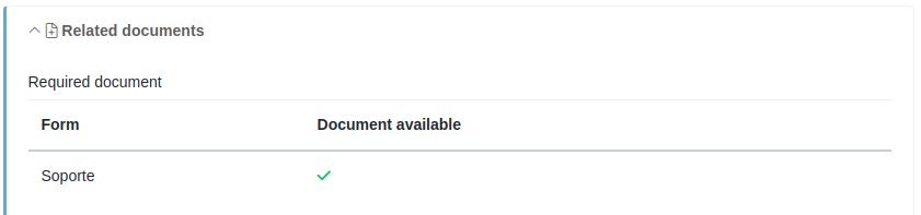 Cuando en Athento haces una solicitud de documentos, puedes ver en el apartado “Related documents” si los documentos requeridos ya han sido adjuntados. Por ejemplo, en una solicitud del tipo documental Soporte aparece una “X” en la columna Document available si aún no se han subido los documentos.