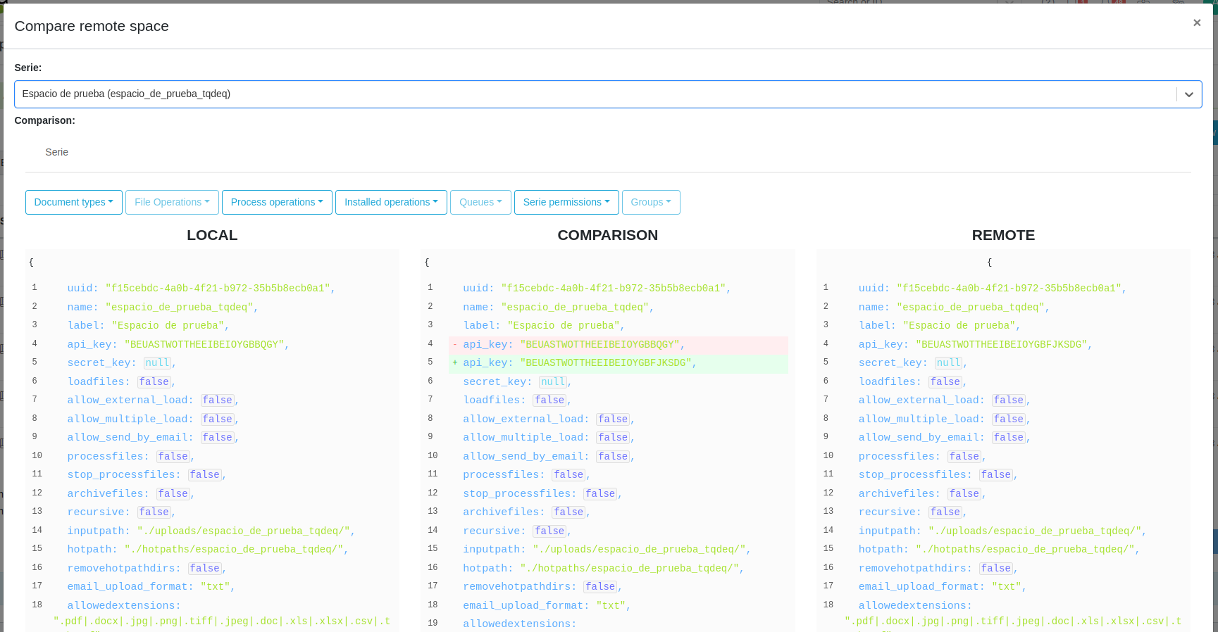 Una vez seleccionado el espacio, Athento nos mostrará las diferencias entre las configuraciones del espacio en ambas instancias.
