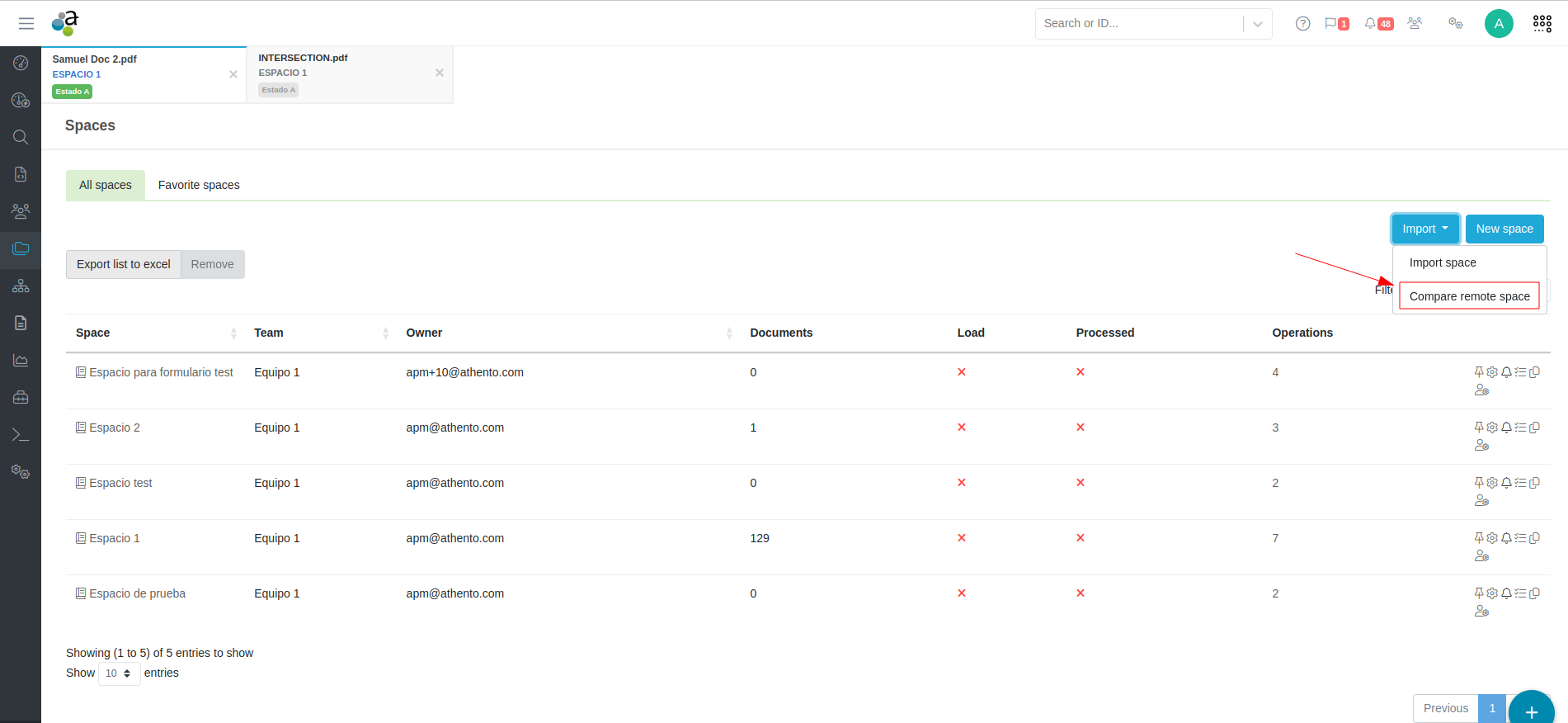 La comparación se puede realizar desde la vista del listado de espacios. Haciendo clic en el botón "Importar" podrás acceder a la opción "Comparar espacio remoto".