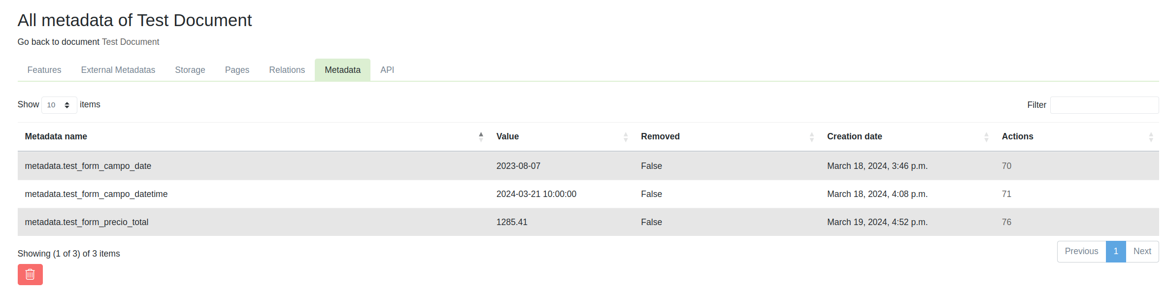 Aquí podrás observar los diferentes metadatos correspondientes al documento con su nombre, su valor, si se encuentra removido lógicamente y su fecha de creación.