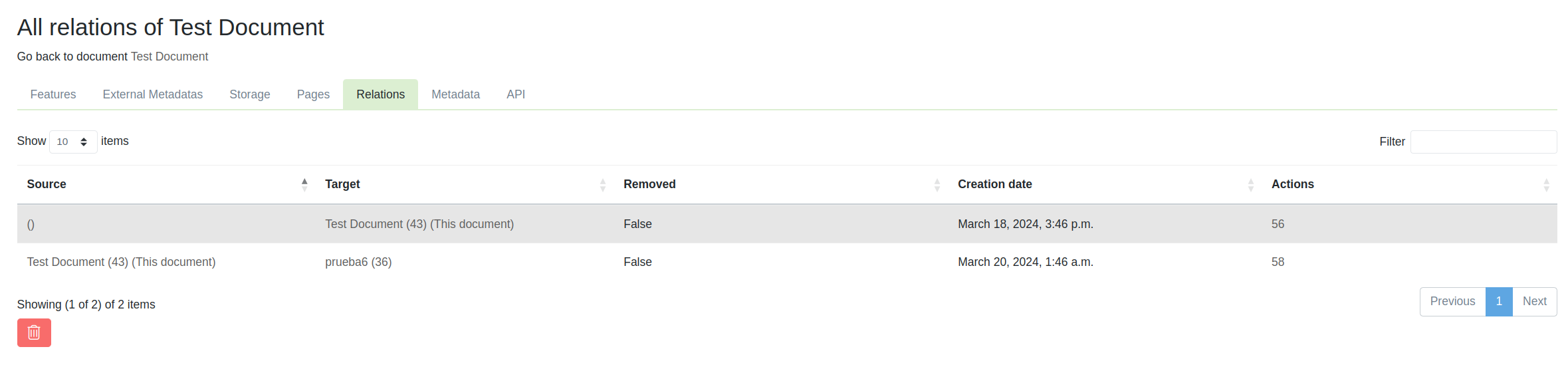 En esta pestaña encontraremos los documentos relacionados que posee el documento actual. Entre los datos que puedes ver, se encuentra el nombre del documento desde el que se originó la relación, el nombre del documento que fue relacionado, si la relación fue removida lógicamente y la fecha en que se relacionaron los documentos.
