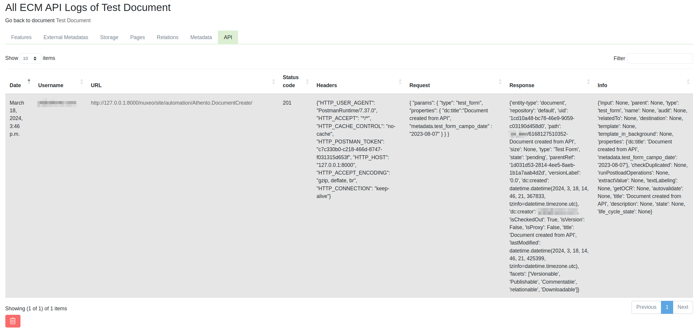 Dentro de esta pestaña se encuentran los distintos logs de API que se corresponden con el documento actual. Por el momento únicamente es posible encontrar los que corresponden al llamado a Athento.DocumentCreate a través de la API. Respecto a dichos logs, podremos ver información como la fecha de ejecución, el usuario, la URL a la que se llamó, la solicitud y los headers de la misma, la respuesta a dicha solicitud e información adicional sobre la llamada.