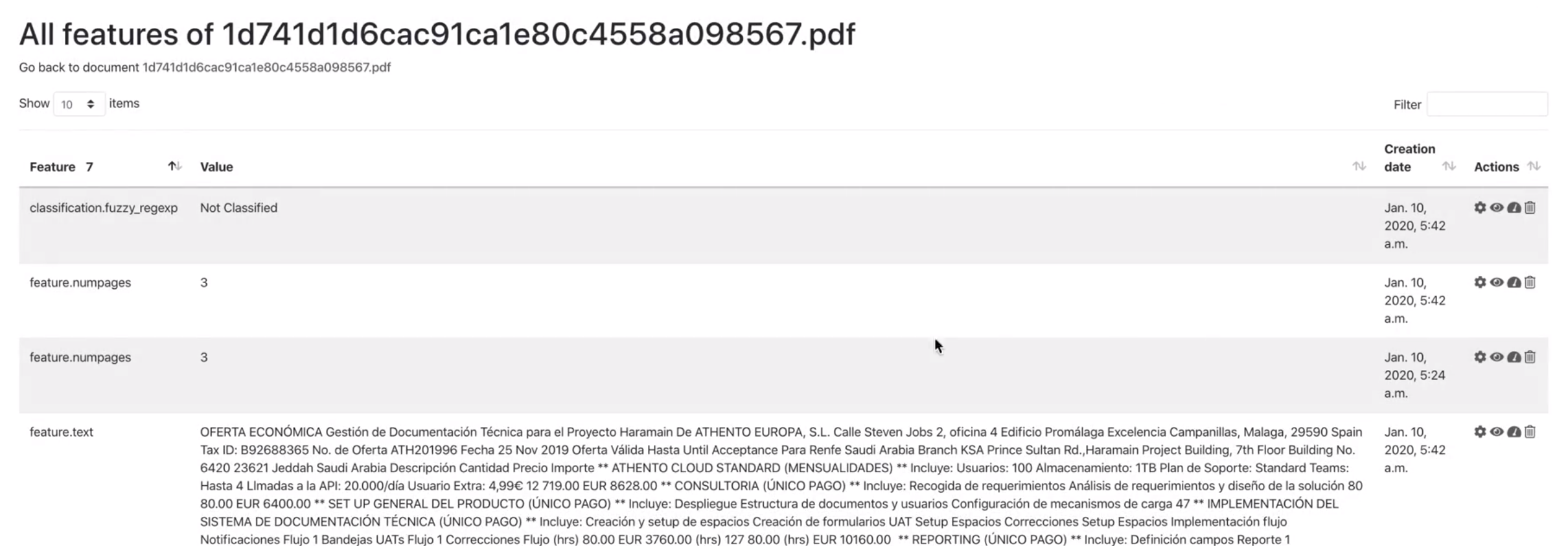 Aquí puedes encontrar información relacionada al documento y que no son metadatos. Las características pueden ser seteadas desde las operaciones que se ejecutan sobre el documento, como por ejemplo en la extracción OCR, la extracción del número de páginas y otras.