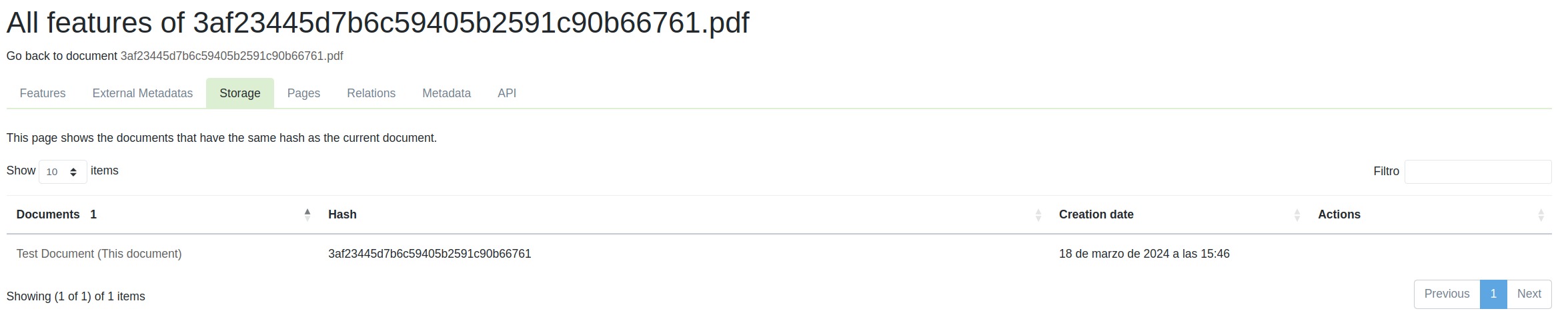Aquí puedes ver principalmente lo que es el hash del documento, además de su nombre y fecha de creación.