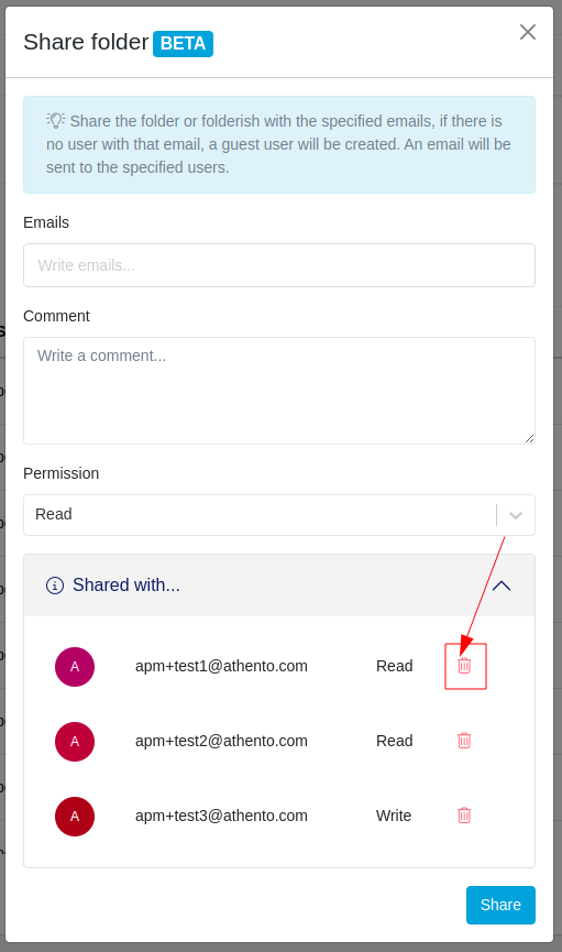 También, se puede eliminar el permiso para un usuario pulsando el botón de la papelera que aparece junto a él.