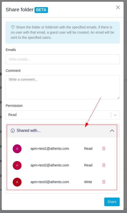 - Correos: Obligatorio. Correos de los usuarios con los que se quiere compartir una carpeta.