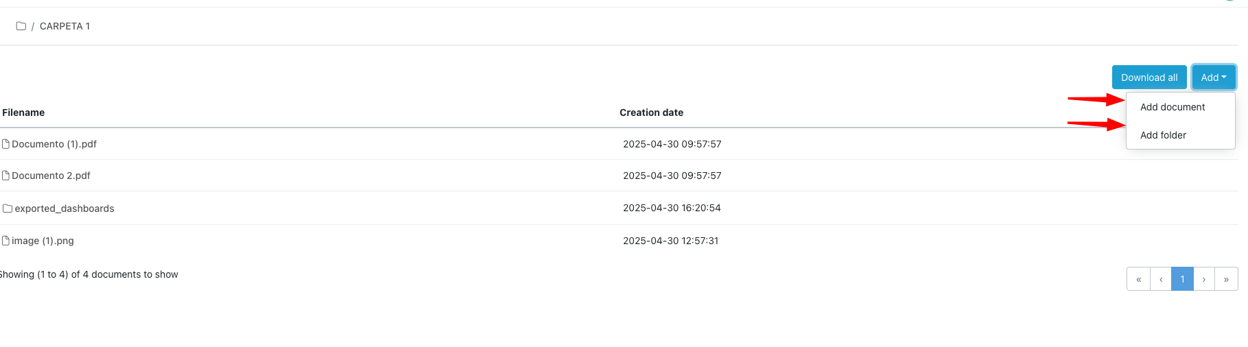 Si se le ha otorgado permisos de escritura sobre la carpeta al usuario, el botón "Add" con las opciones "Add document" y "Add folder" le aparecerá habilitado y podrá subir un nuevo documento a la misma.