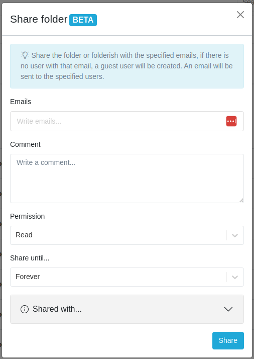 Para compartir, ve a la navegación y encuentra la carpeta que quieres compartir. En el menú de los 3 puntos a la derecha del nombre de la carpeta, encontrarás la opción "Share" con la etiqueta BETA.