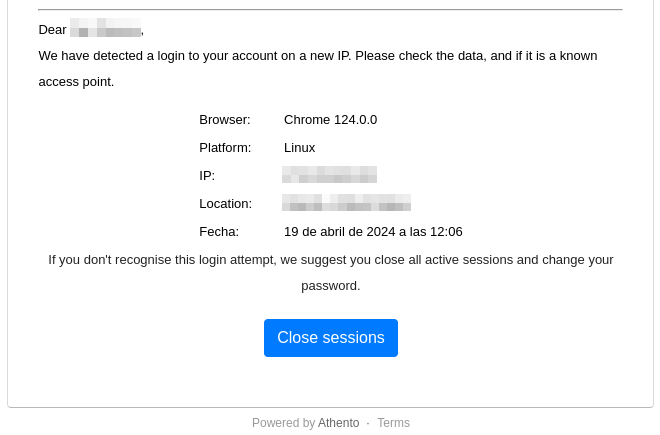 Tanto en el inicio de sesión, controlando si se inicia sesión desde una nueva dirección como también en caso que se utilice una sesión ya existente desde una dirección distinta, Athento realiza las comprobaciones necesarias y en caso de detectar actividad sospechosa, envía una alerta al correo del usuario.