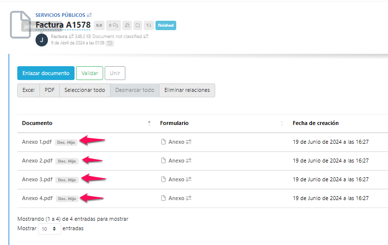 En Athento podemos identificar el documento padre o documento principal, y sus documentos hijos o relacionados.