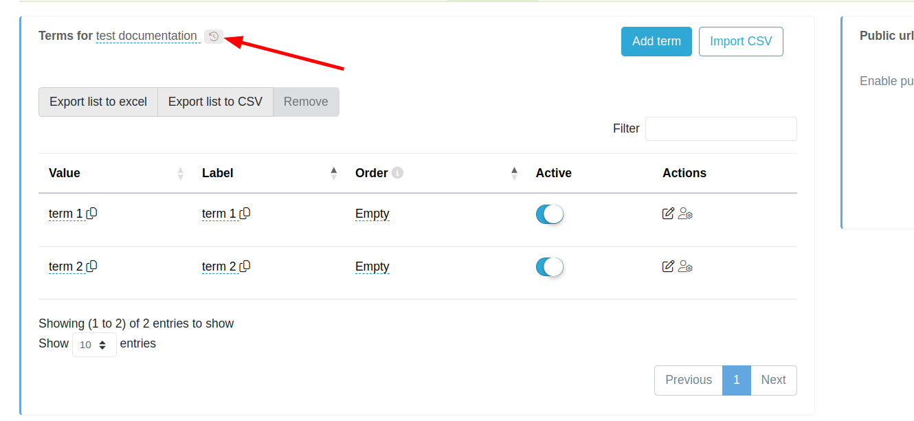 Una vez dentro del diccionario, puedes abrir el historial usando el icono que se muestra junto a su nombre. Este botón desplegará un cuadro de dialogo con la tabla del historial del diccionario.