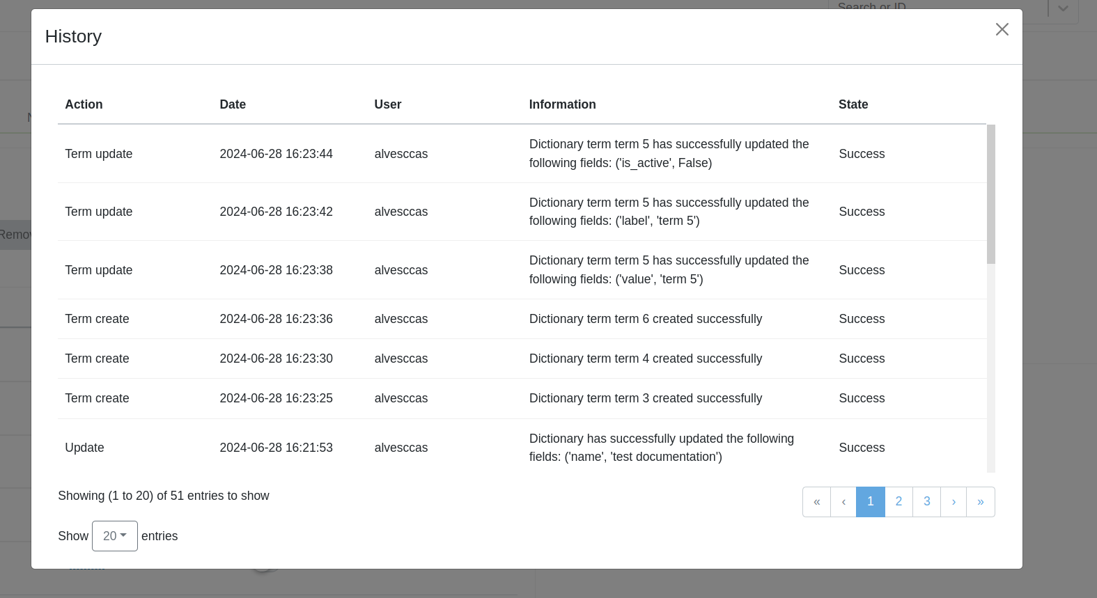- Action: Tipo de acción que ha ocurrido. Puede ser actualización, eliminación o creación de un diccionario o de un término.