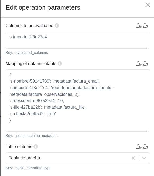 - Mapping of data into itable / Mapeo de datos en la tabla: Texto en formato JSON donde se deben especificar los valores para las columnas de la tabla, ya sean valores fijos o expresiones con metadatos del documento. Las columnas que no sean indicadas en este JSON, no se rellenarán con ningún valor. En otras palabras, aquí se indican los nombres de las columnas y los valores que van a tomar.