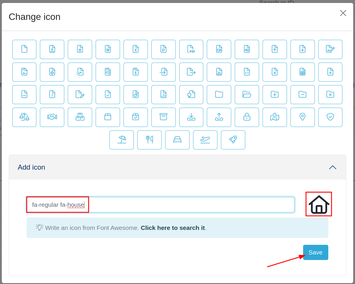 Ese texto se debe escribir en el campo, y si es correcto, se previsualiza el icono a la derecha y permite guardarlo.