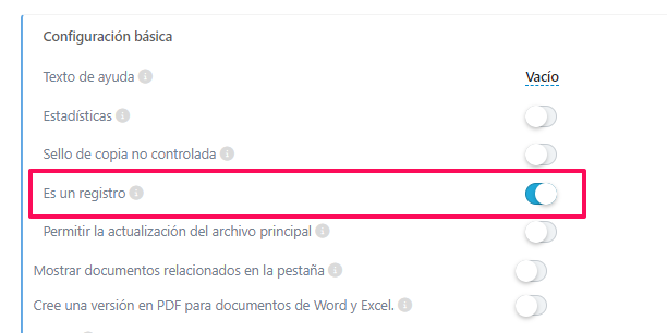 Para ello, será necesario marcar el check de "Es un registro" en la configuración del formulario.