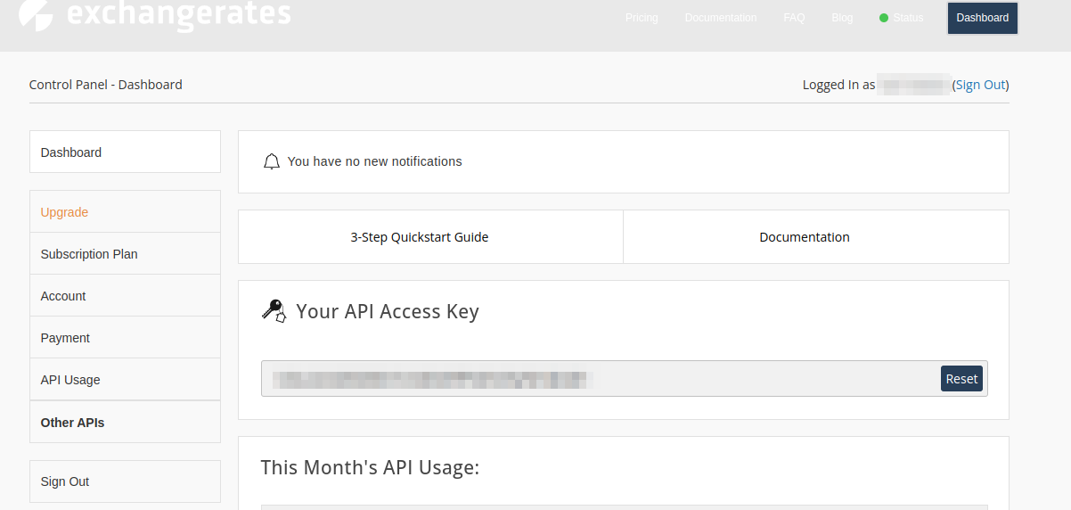 Para realizar estas conversiones y tener los tipos de cambio actualizados, esta operación utiliza Exchange Rates API. Es por esto que para que funcione correctamente, se deberá configurar la setting EXCHANGE_RATES_API_KEY con una clave válida para poder realizar las consultas. Es posible registrarse en el sitio en forma gratuita para obtener esta clave de acceso, que podrás encontrar en el Dashboard de tu usuario. Cabe destacar que el uso gratuito de dicha API permite hasta 100 llamadas por mes.