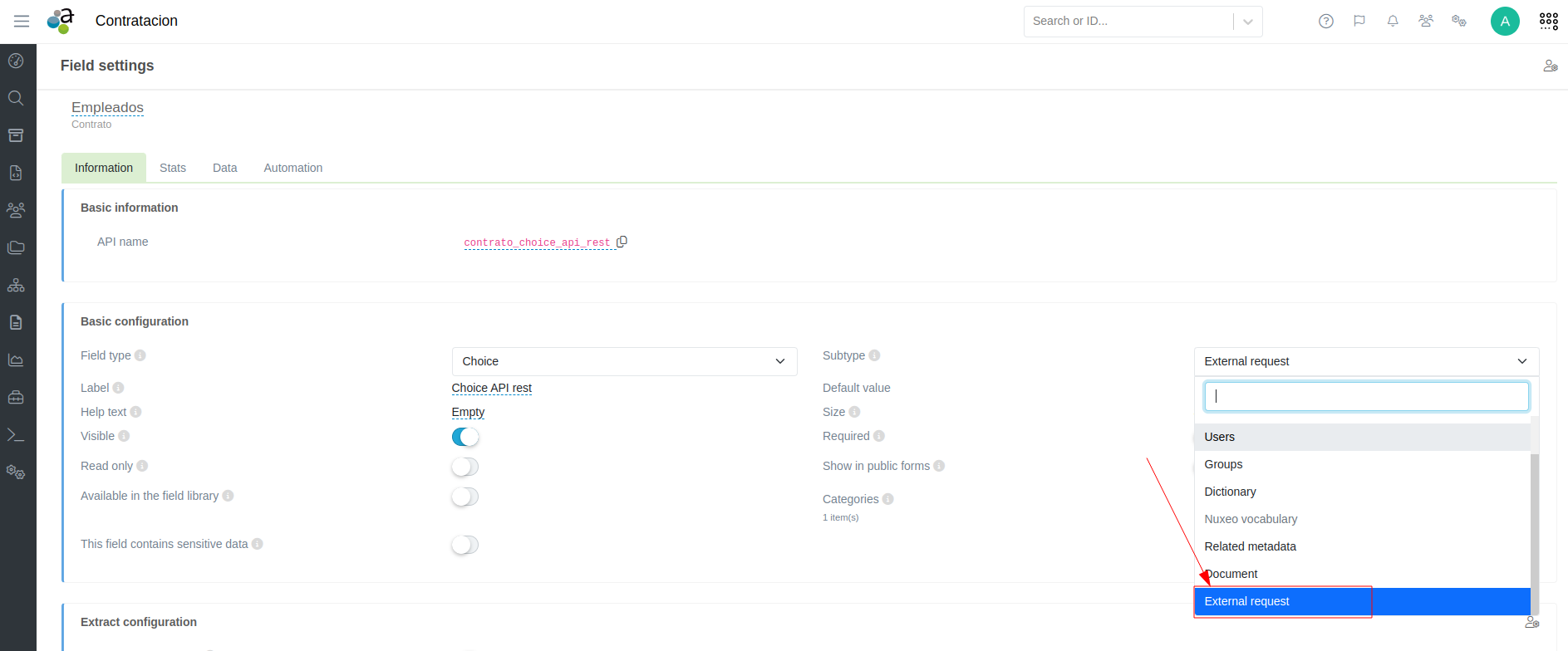 Para hacerlo, primero debes crear un campo de tipo "selección" o "selección múltiple" y luego seleccionar el subtipo "External request".