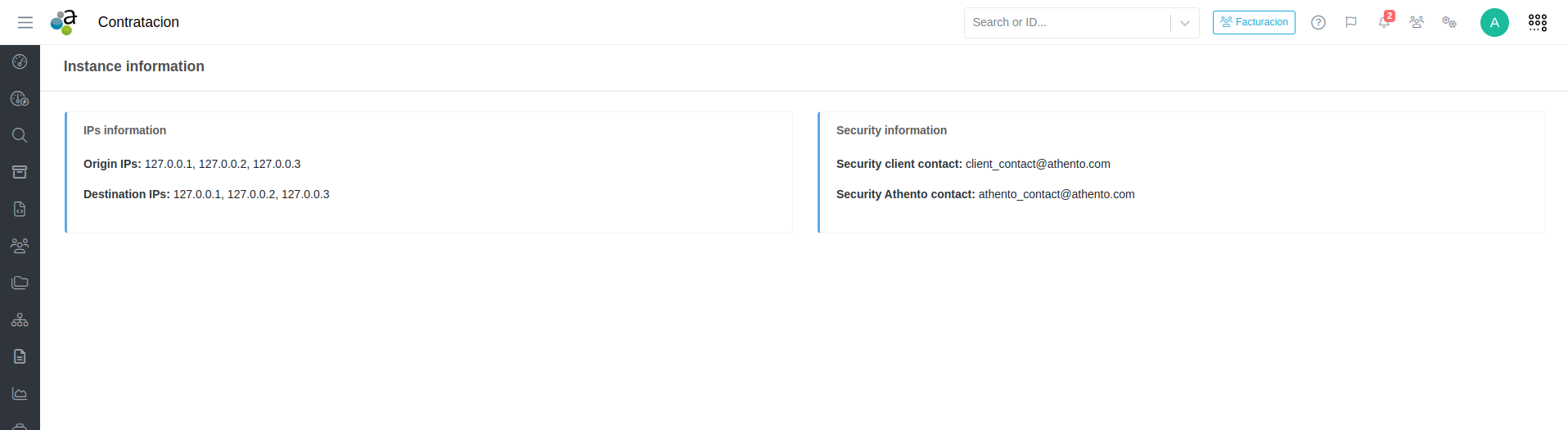 Athento dispone de una página de información sobre la instancia, donde podremos consultar datos sobre la misma. En ella encontraremos datos sobre las IPs que gestiona la instancia y sobre seguridad.