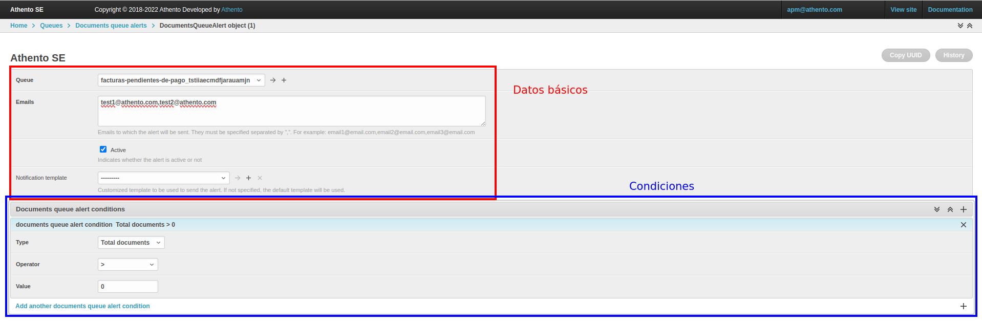 La configuración de las alertas se hace desde la administración en el apartado "Home > Queues > Documents queue alerts".