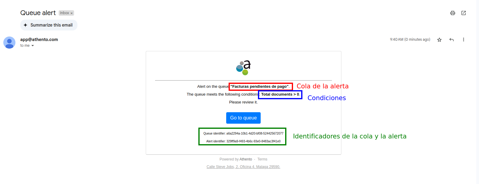 Cuando se realice el envío de una alerta, los correos configurados en la propiedad "emails" recibirán una notificación como la siguiente: