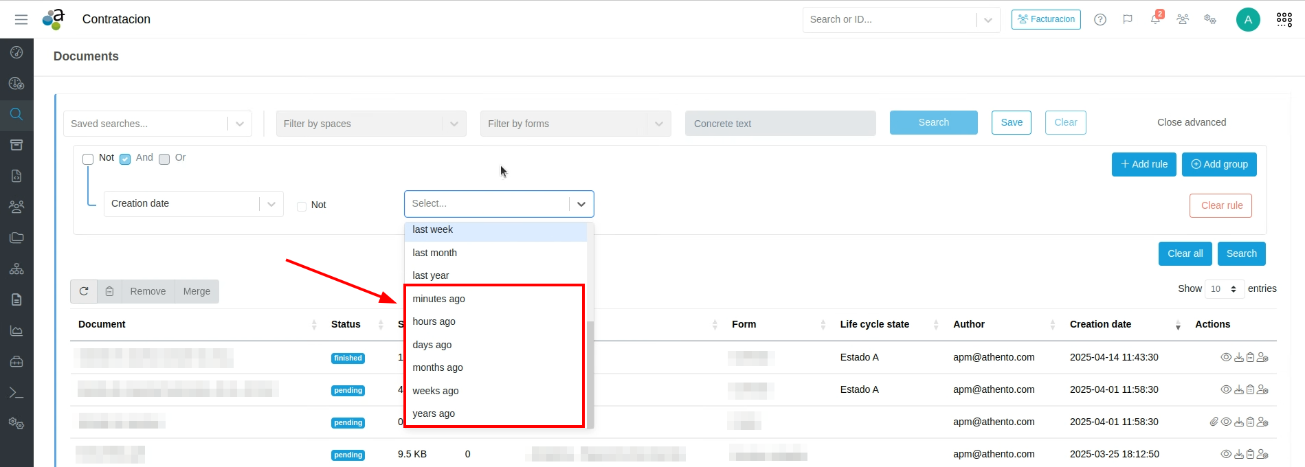 Athento permite aplicar filtros por un período de tiempo atrás para la fecha de creación y la fecha de validación.