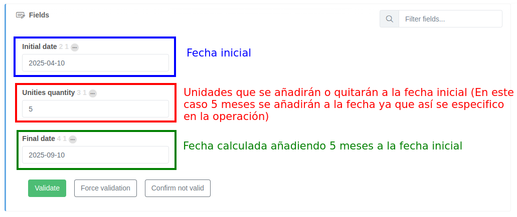 Ejemplo de ejecución donde se ha configurado una operación para sumar x meses especificados en un campo del documento a la fecha inicial: