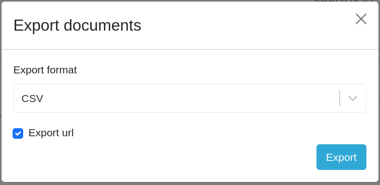 Este botón abrirá un cuadro de diálogo para seleccionar el formato de la exportación. También puedes incluir las URLs de los documentos en el informe. Para las carpetas la URL será la de la navegación.