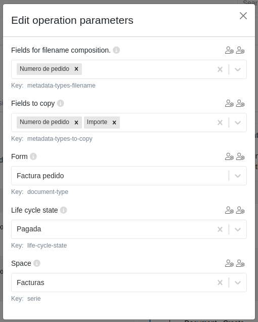 - Campos a copiar: Campos que se copiarán del documento para el cual se lanza la operación, al nuevo documento. Los campos deben estar incluidos en el formulario usado para el nuevo documento creado, para ello deben estar en la biblioteca de campos.
